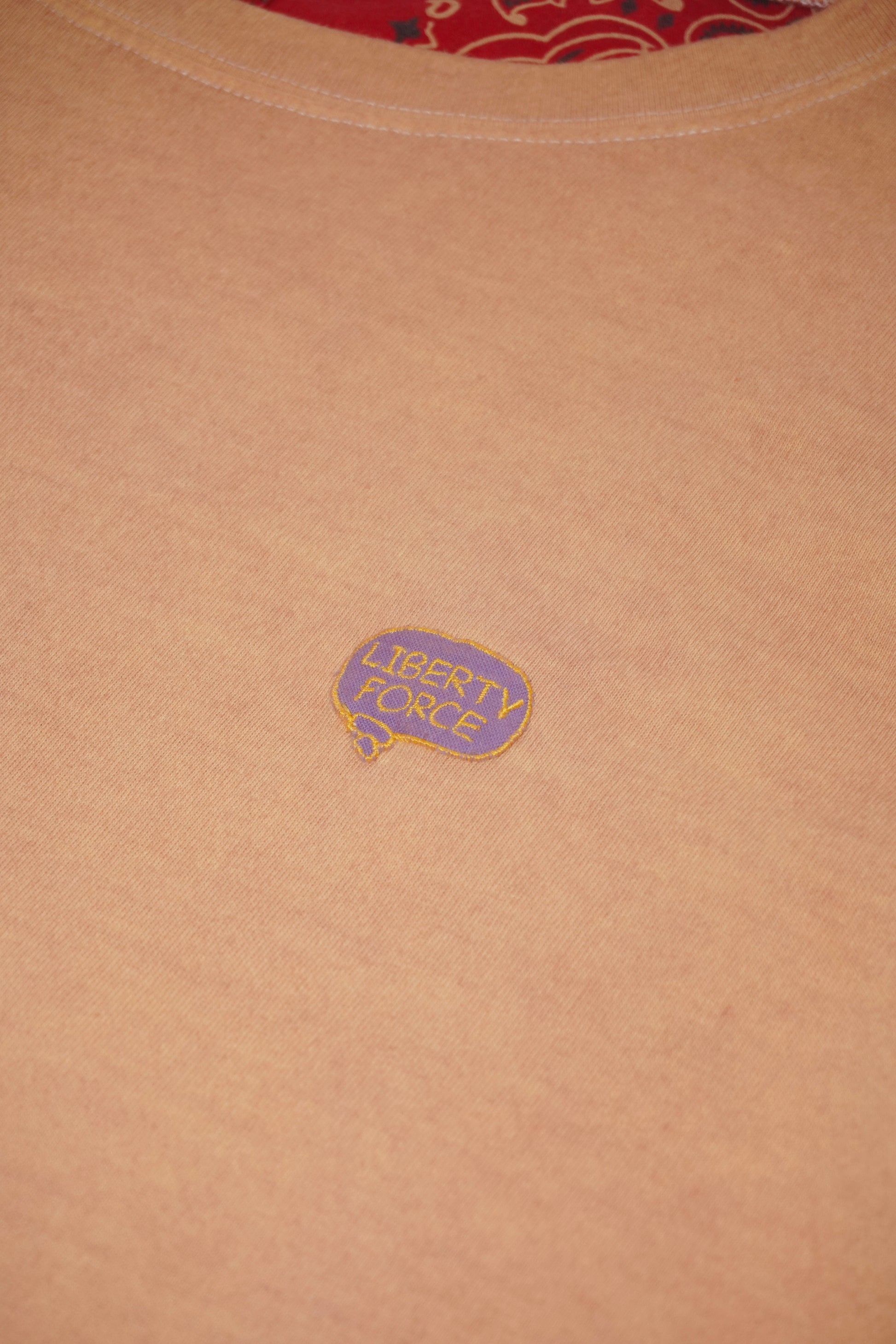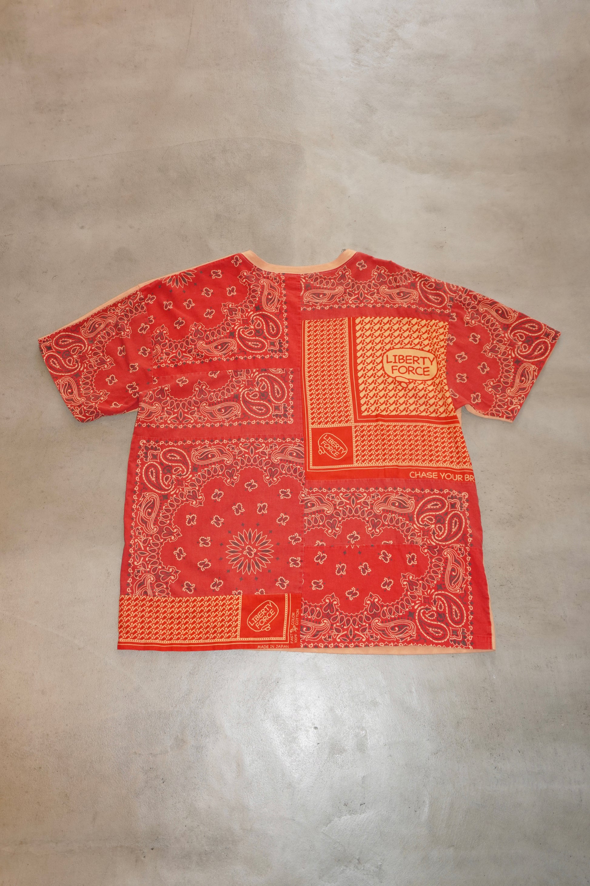 大きめのシルエットで、男女兼用のワンサイズ展開。アメリカから取り寄せたバンダナ1枚1枚にエイジング加工を施した後、LIBERTY FORCEバンダナと合わせて背面全体につなぎ合わせています。胸元の刺繍ワッペンがポイント。通気性が良いバンダナ生地が心地良いです。
