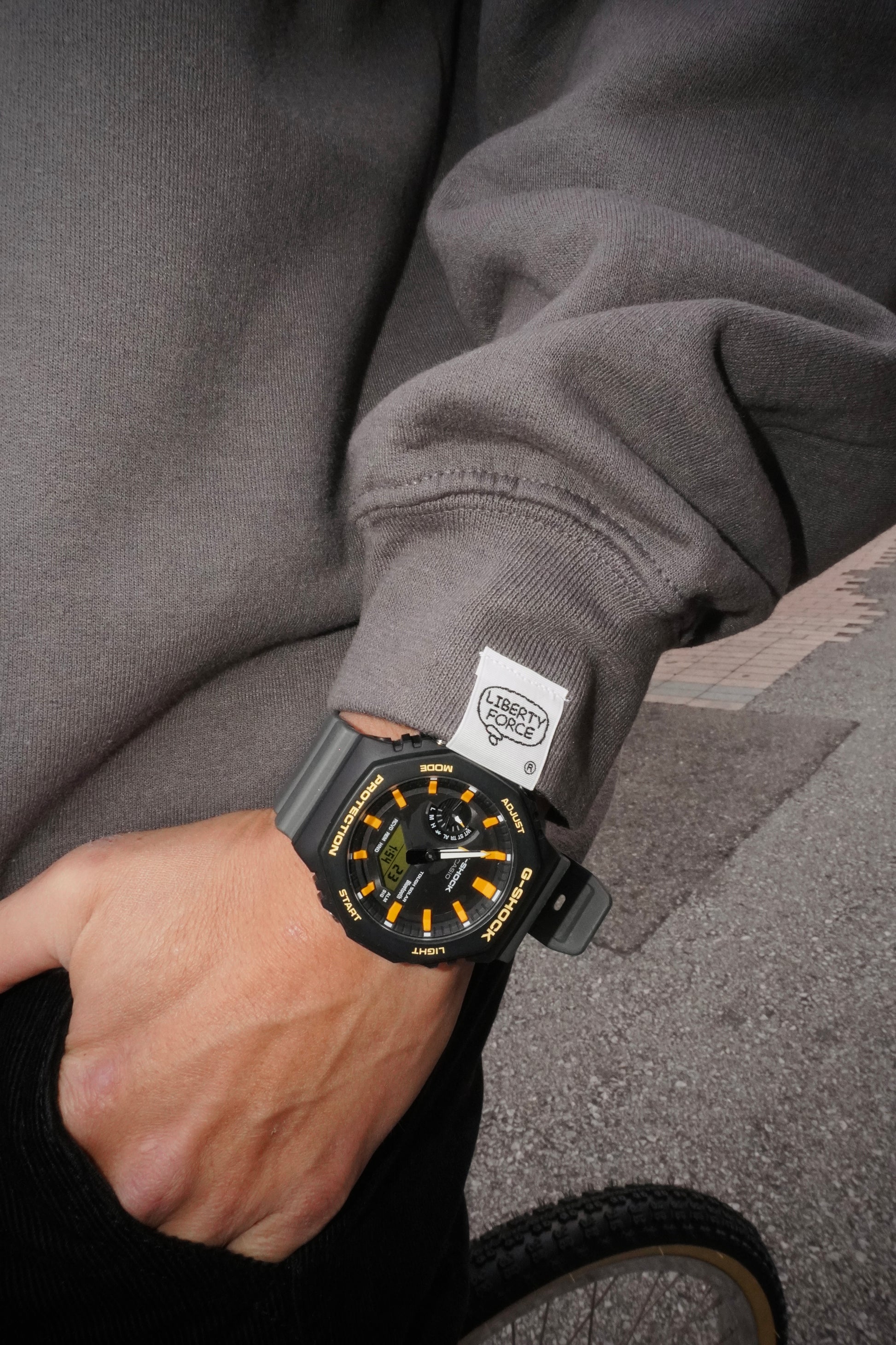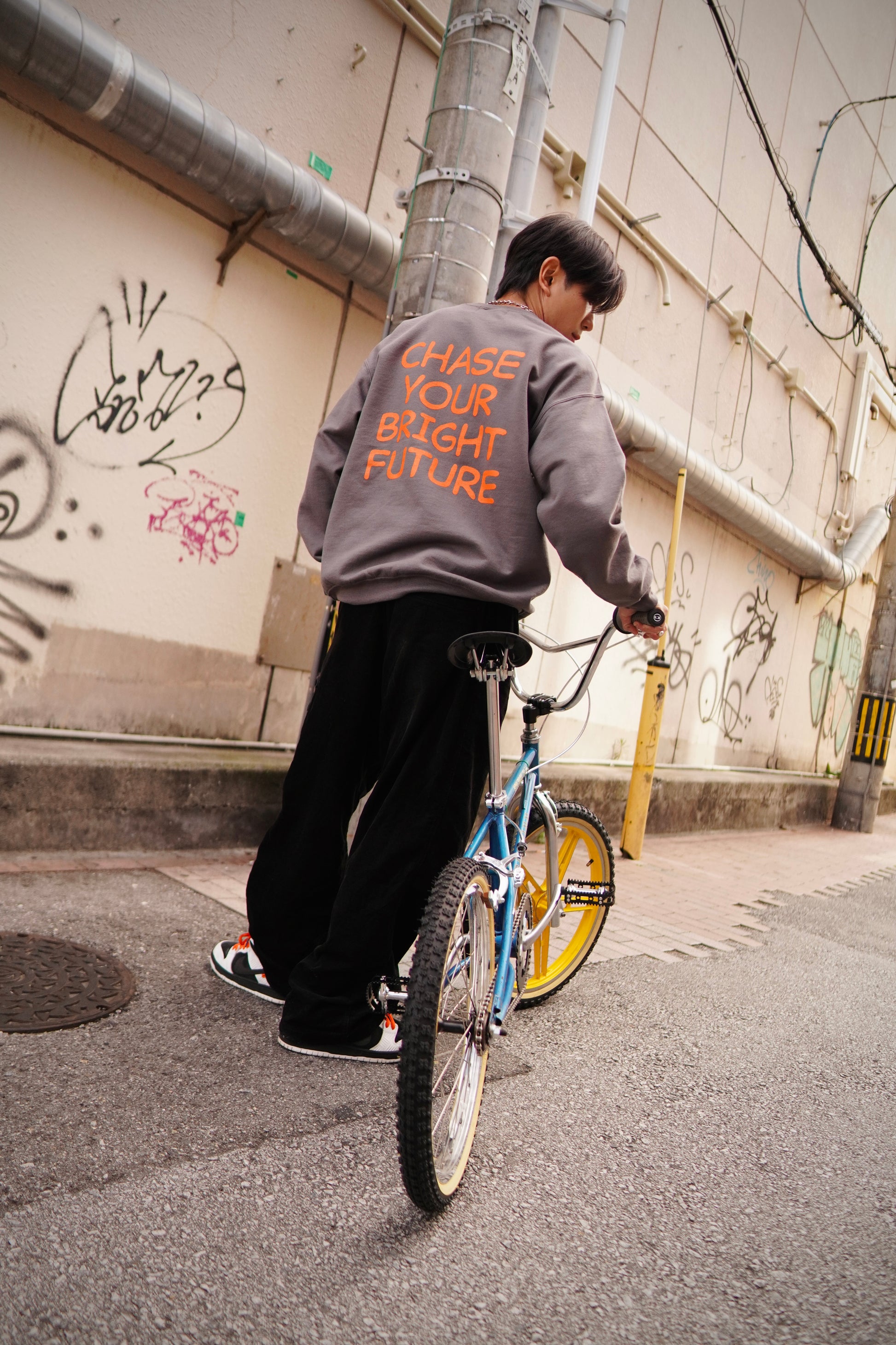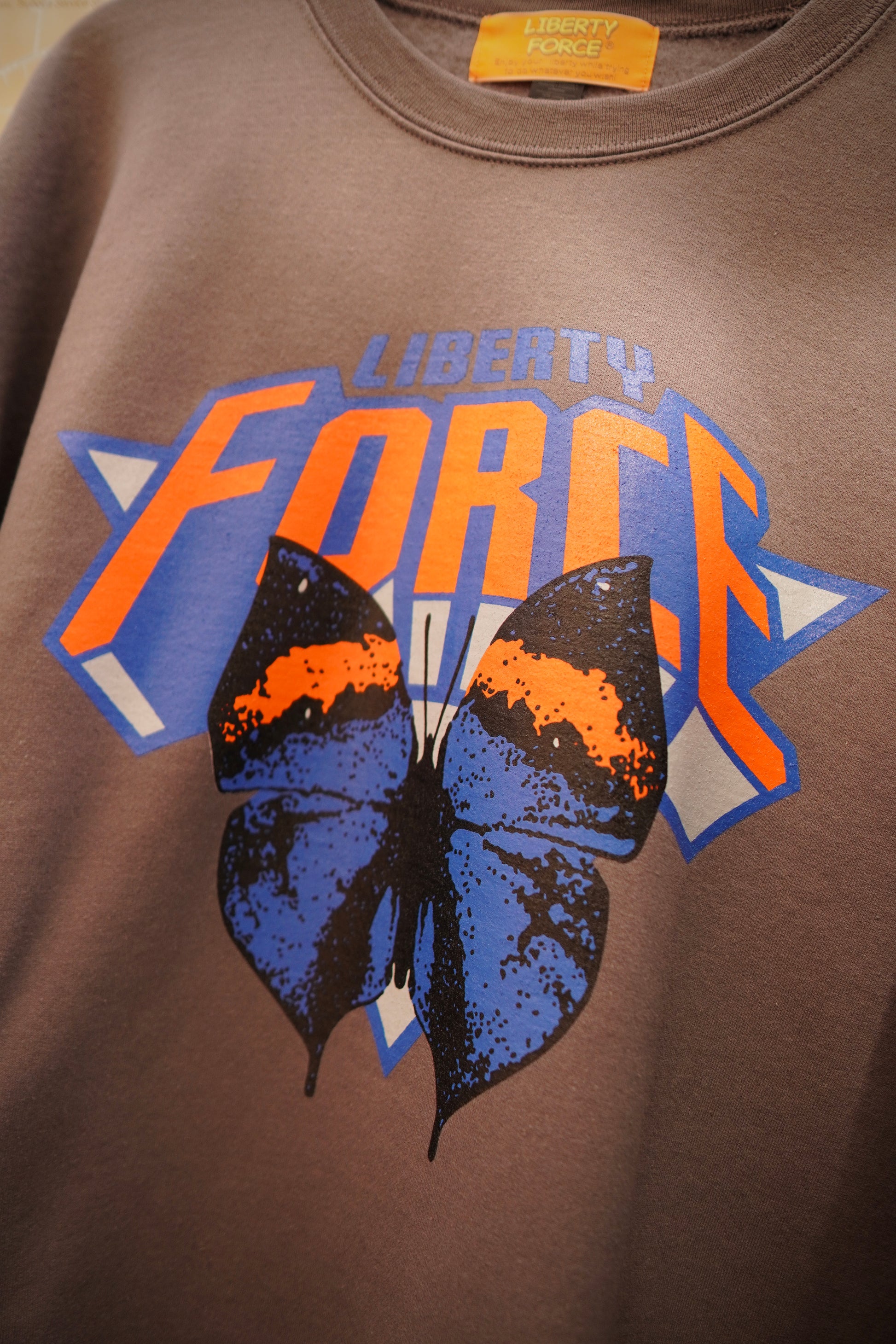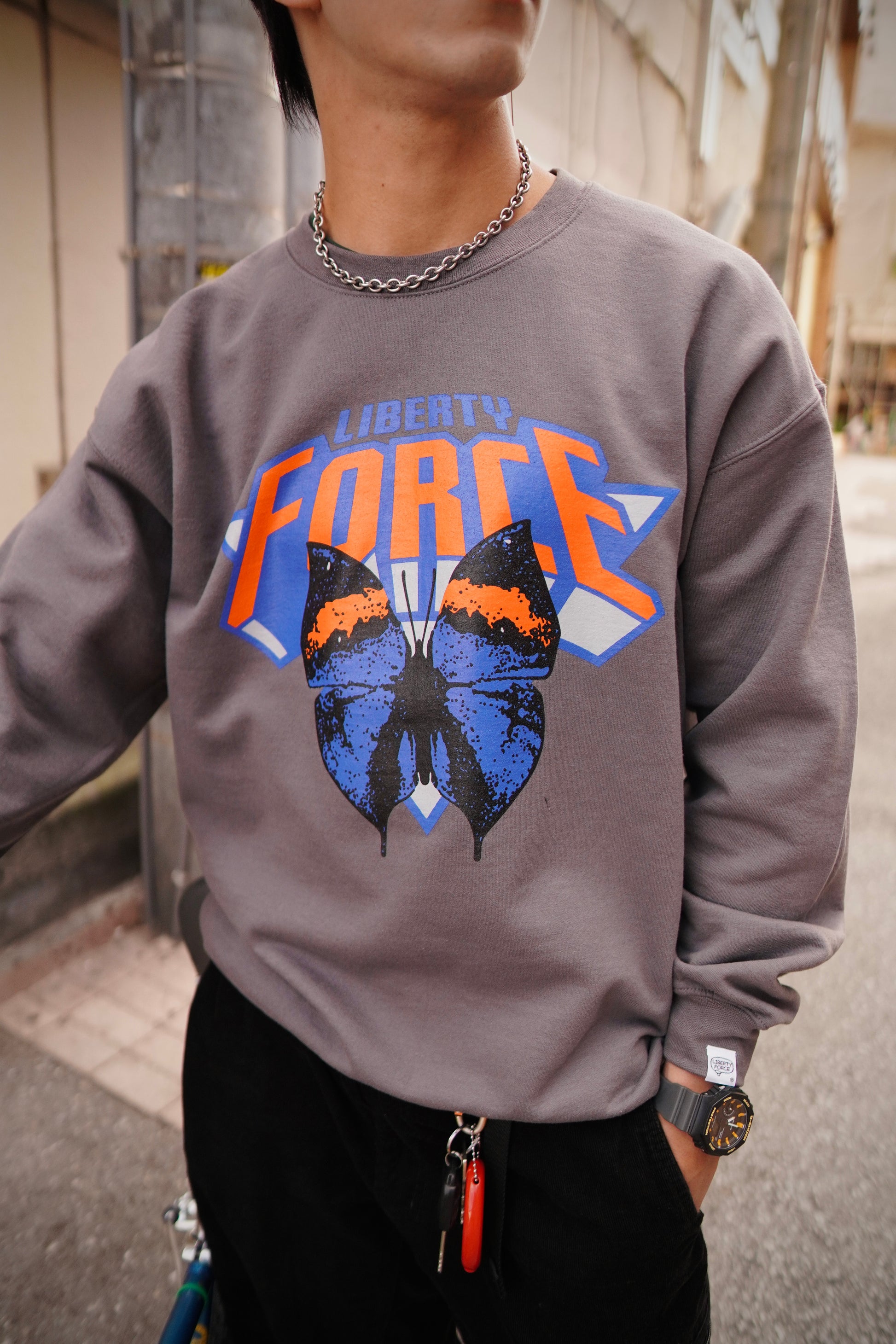 沖縄の天然記念物『コノハチョウ』のグラフィックと、背中にCHASE YOUR BRIGHT FUTURE(君の明るい未来を追いかけて)のメッセージをプリントした裏起毛クルーネックスウェットです。左袖のLIBERTY FORCE吹き出しロゴのピスネームタグがポイントです。2月中旬〜下旬お届け予定。