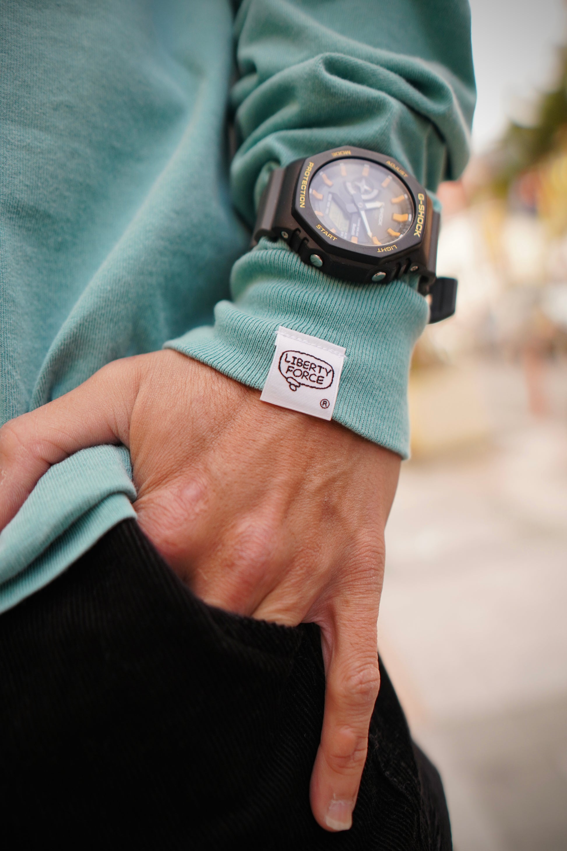 沖縄の天然記念物『コノハチョウ』のグラフィックと、背中にCHASE YOUR BRIGHT FUTURE(君の明るい未来を追いかけて)のメッセージをプリントした ロングスリーブTシャツです。 左袖のLIBERTY FORCE吹き出しロゴピスネームタグがポイントです。
