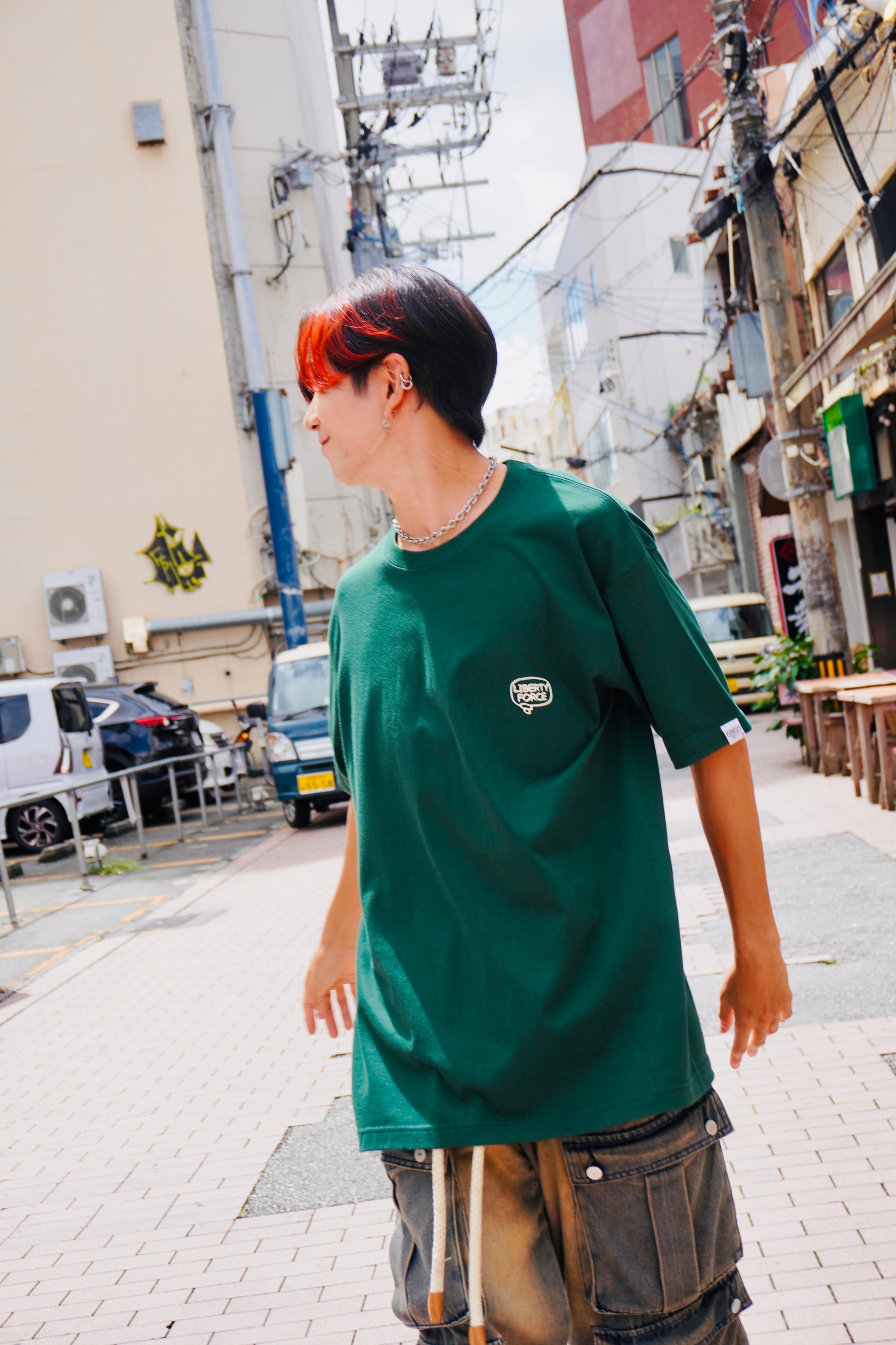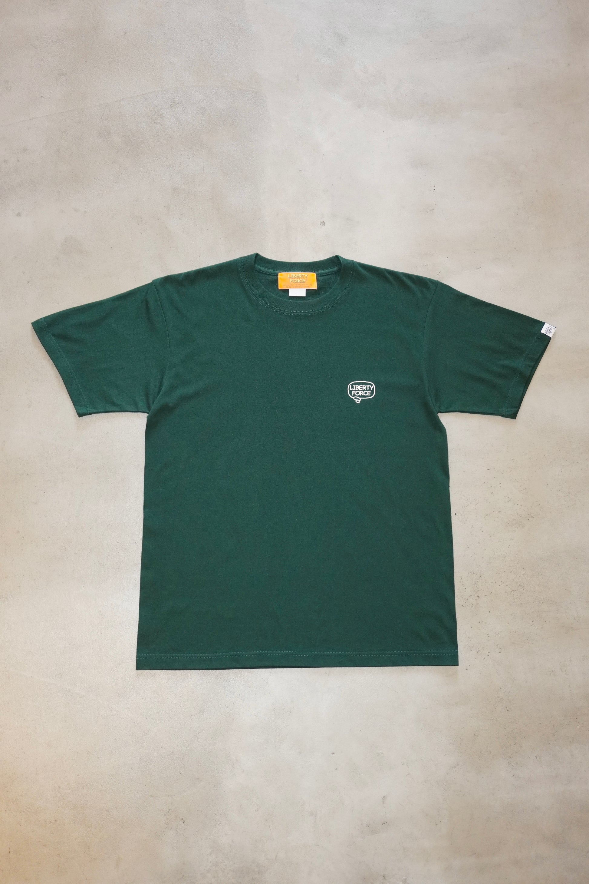 左胸にLIBERTY FORCE吹き出しロゴと、背中に"CHASE YOUR BRIGHT FUTURE"ロゴをプリントした定番デザインのTシャツです。左袖のLIBERTY FORCE吹き出しロゴのピスネームタグがポイントです。
